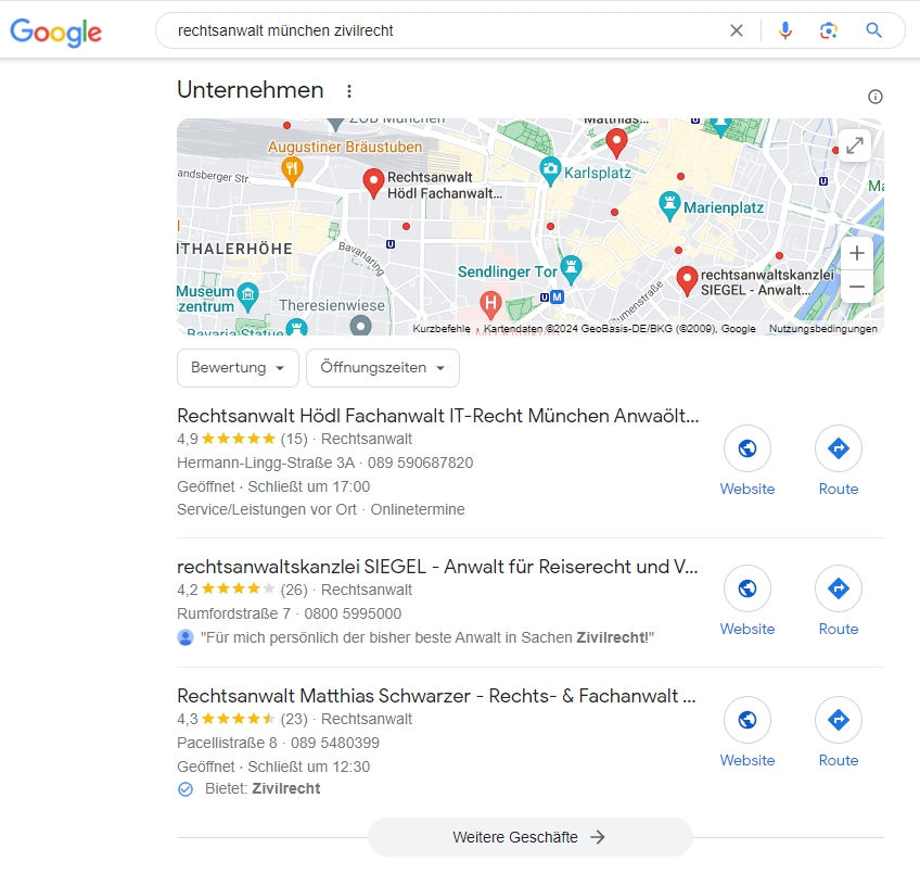 Um zu einem Keyword wie Rechtsanwalt Zivilrecht München unter die Top 3 unterhalb der Karte bei Google (dem. sog. Local Pack) zu gelangen, ist ein eigenes Google Unternehmensprofil (früher Google My Business) die Voraussetzung. Dieses kann man bis zu einem gewissen Grad für wichtige Suchbegriffe optimieren. Im Folgenden zeigen wir dir, welche Möglichkeiten dir hier zur Verfügung stehen.