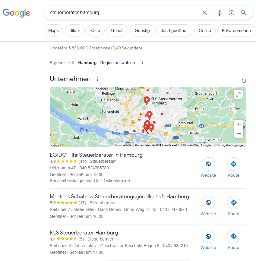 Um zu einem Keyword wie Steuerberater Hamburg unter die Top 3 unterhalb der Karte bei Google (dem. sog. Local Pack) zu gelangen, ist ein eigenes Google Unternehmensprofil (früher Google My Business) die Voraussetzung. Dieses kann man bis zu einem gewissen Grad für wichtige Suchbegriffe optimieren. Im Folgenden zeigen wir dir, welche Möglichkeiten dir hier zur Verfügung stehen.