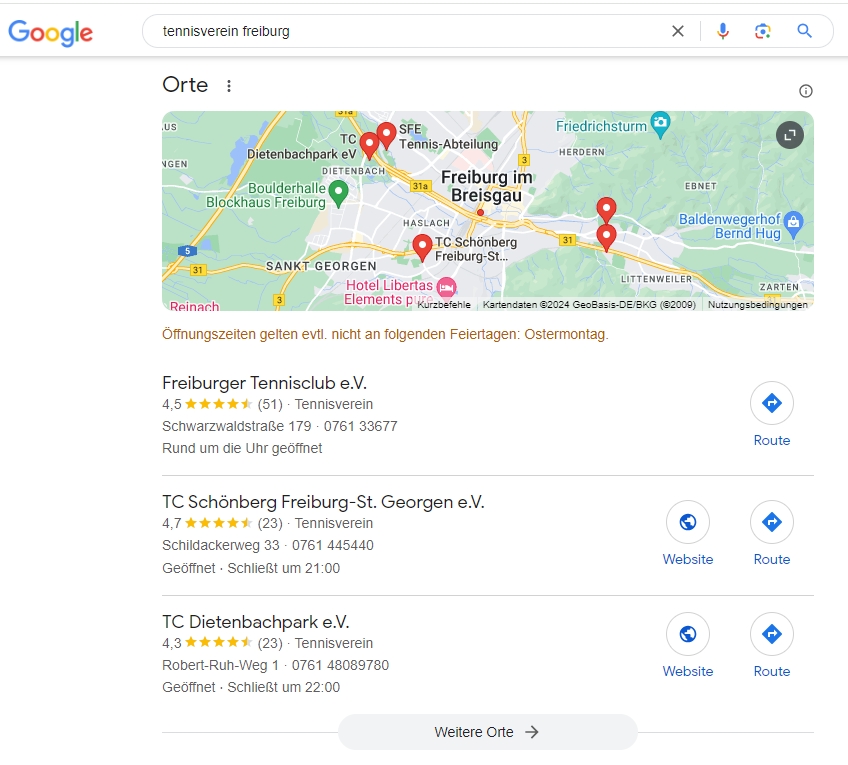 Um zu einem Keyword wie Tennisverein Freiburg unter die Top 3 unterhalb der Karte bei Google (dem. sog. Local Pack) zu gelangen, ist ein eigenes Google Unternehmensprofil (früher Google My Business) die Voraussetzung. Dieses kann man bis zu einem gewissen Grad für wichtige Suchbegriffe optimieren. Im Folgenden zeigen wir dir, welche Möglichkeiten dir hier zur Verfügung stehen.