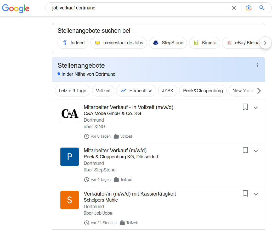 Dementsprechend gehören auch Rich Snippets zu den Rich Results. Sie sind sozusagen eine Teilmenge davon. Allerdings gehören zu den Rich Suchergebnissen noch weitere Elemente, die keine Rich Snippets sind. Hierzu gehören beispielsweise die Einträge bei Google for Jobs, die ebenfalls mithilfe von Strukturierten Daten erzeugt werden. Diese Einträge erscheinen nicht im eigenen Google-Snippet sondern in der Job-Box von Google for Jobs. Hier ein Beispiel: